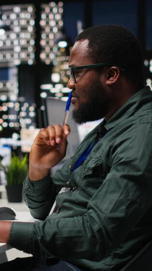 Vertical Office worker reviewing KPI metrics on monitor and analytics on desktop, building a vision and business strategy to accomplish objectives and success. Professional mindset after hours. Camera B. Pro Video
