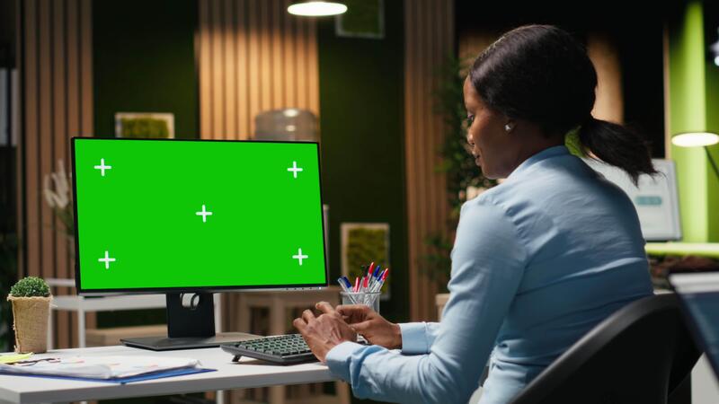 Isolated chroma key on desktop pc with black analyst analyzing KPI metrics, applying a strategic mindset to business development plans. Support innovation and goals achievement. Camera B. Pro Video