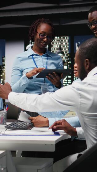 Vertical Black confident business partners in office at night analyzing metrics on desktop pc, focusing on report writing and planning to drive results and success. Doing overtime together. Camera A. Pro Video