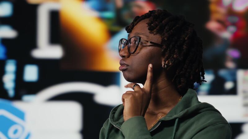 Close up of woman engaging with multimedia dashboards, showcasing power of technology and digital content. Person having fun interacting with device apps and internet websites Pro Video