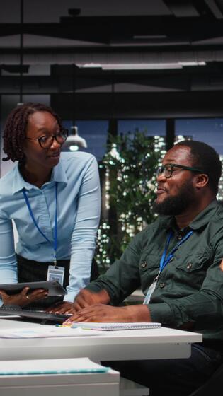 Vertical African american analysts collaborating on a project with financial forecasting, projecting data to expand the enterprise activity and profit. Teamwork in workspace to ensure objectives. Camera A. Pro Video