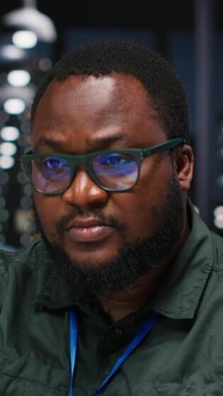 Vertical African american analyst wondering about possible solutions to a dilemma on computer, concentration to evaluate projections with logical deduction and intuitive observation at night. Camera B. Pro Video