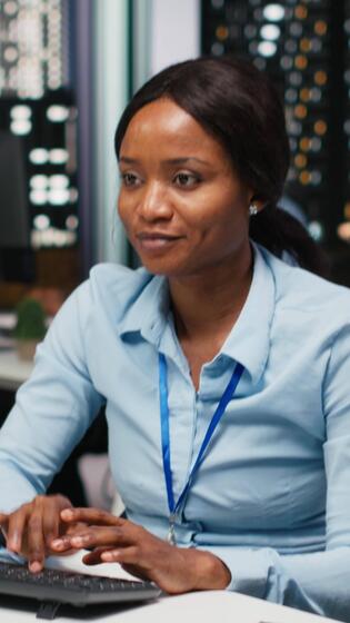 Vertical Black young analyst focused on IT company development with digital tools, review analytics and performance metrics at workstation. Staff planning solutions and aligning objectives. Camera B. Pro Video