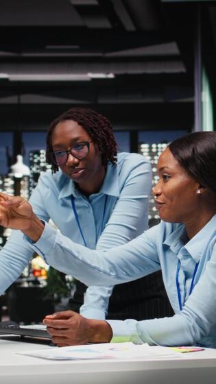 Vertical Team of black staff members working with finances data and performance metrics, aligning vision and objectives to drive success within a multinational company environment at night. Camera A. Pro Video