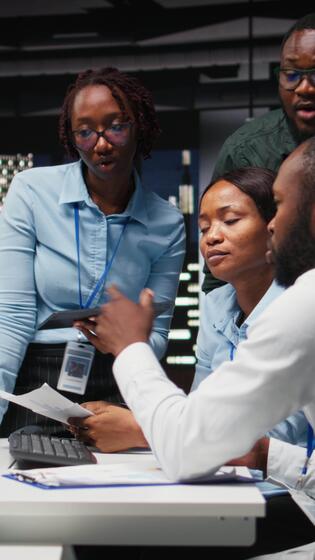 Vertical African american team of employees working late on goal setting, studying data insights and performance metrics. Colleagues creating reports for business administration, strategy room. Camera A. Pro Video