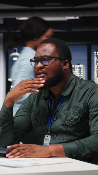 Vertical African american analyst wondering about possible solutions to a dilemma on computer, concentration to evaluate projections with logical deduction and intuitive observation at night. Camera A. Pro Video
