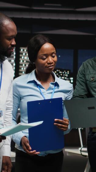 Vertical Portrait of black workers collaborating on project strategy and briefing, using data from charts on gadgets to drive performance metrics. Fostering teamwork and a workplace partnership. Camera B. Pro Video