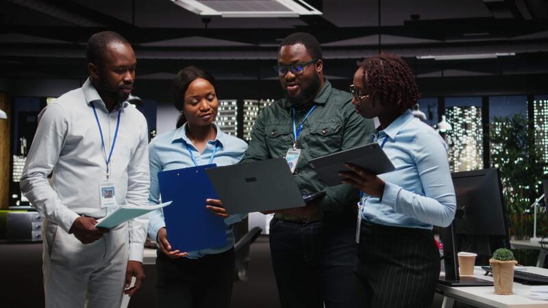 Portrait of black workers collaborating on project strategy and briefing, using data from charts on gadgets to drive performance metrics. Fostering teamwork and a workplace partnership. Camera A. Pro Video