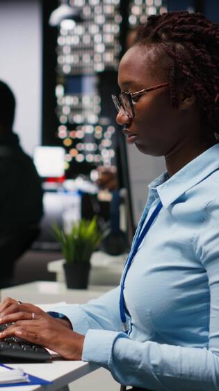 Vertical African american specialist handles neural networks systems for data forecasting, combining AI automation tools with digitalization to drive multinational company efficiency and innovation. Camera B. Pro Video