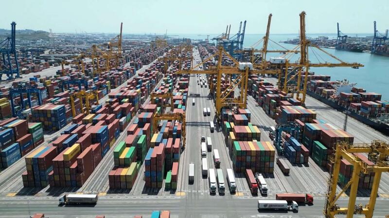 Aerial view of a bustling container port with rows of colorful shipping containers and cranes near a body of water under a clear sky. Pro Video
