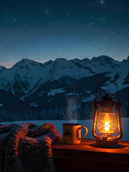 Lo-Fi Virtual Background Loop Winter night on a balcony with a lantern and mug against mountain backdrop Free Video