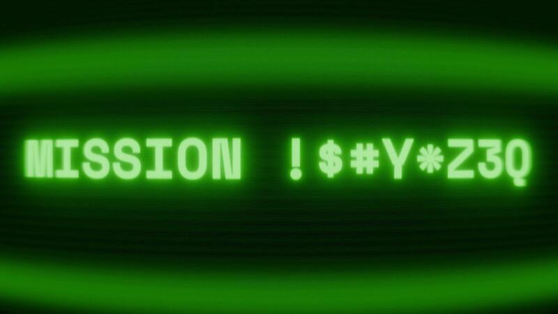 Old green CRT screen showing text MISSION COMPLETE appearing in random glitch and coding style Pro Video