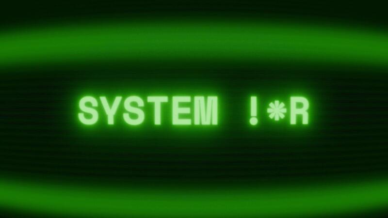 Old green CRT screen showing text SYSTEM END appearing in random glitch and coding style Pro Video