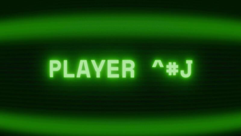 Old green CRT screen showing text PLAYER TWO appearing in random glitch and coding style Pro Video