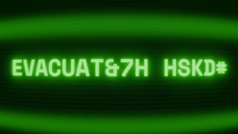 Old green CRT screen showing text EVACUATION ROUTE appearing in random glitch and coding style Pro Video