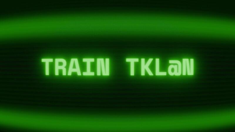 Old green CRT screen showing text TRAIN TRACK appearing in random glitch and coding style Pro Video