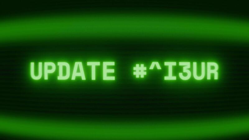 Old green CRT screen showing text UPDATE NOTICE appearing in random glitch and coding style Pro Video