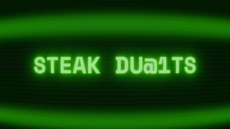 Old green CRT screen showing text STEAK DINNER appearing in random glitch and coding style Pro Video