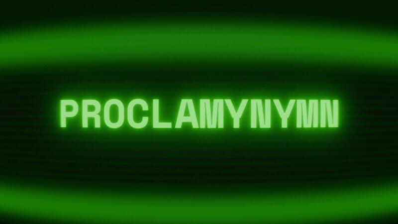 Old green CRT screen showing text PROCLAMATION appearing in random glitch and coding style Pro Video