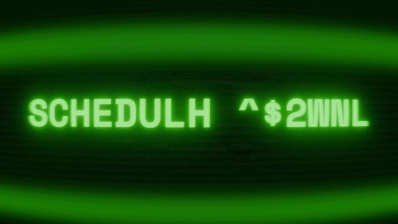 Old green CRT screen showing text SCHEDULE UPDATE appearing in random glitch and coding style Pro Video