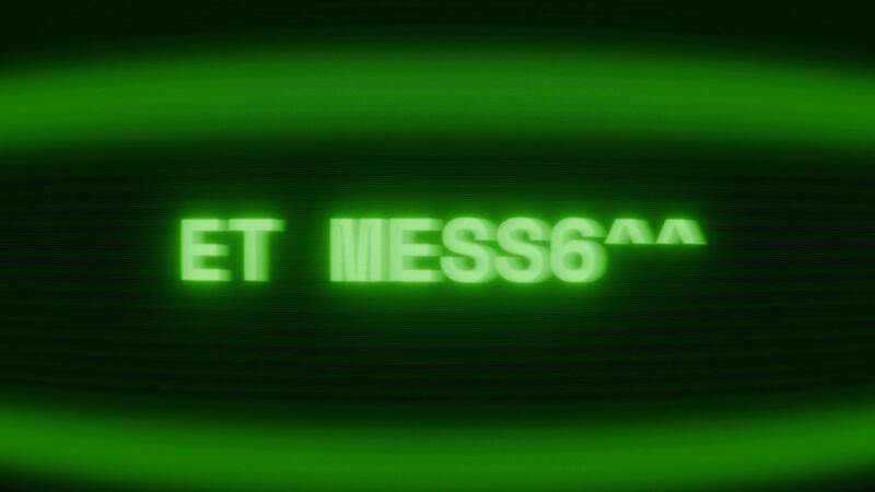 Old green CRT screen showing text ET MESSAGE appearing in random glitch and coding style Pro Video