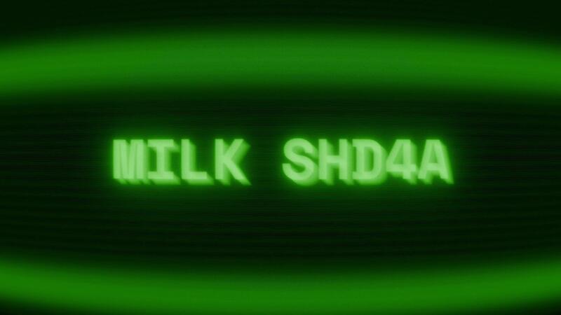 Old green CRT screen showing text MILK SHAKE appearing in random glitch and coding style Pro Video