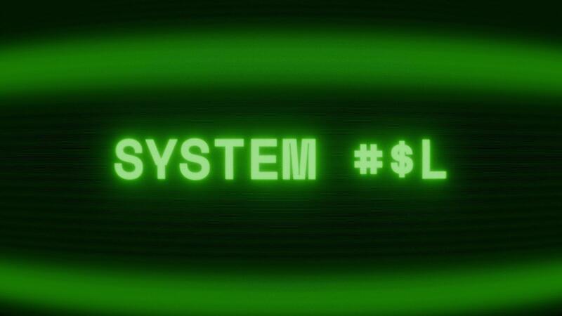 Old green CRT screen showing text SYSTEM OFF appearing in random glitch and coding style Pro Video