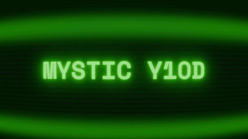 Old green CRT screen showing text MYSTIC CODE appearing in random glitch and coding style Pro Video