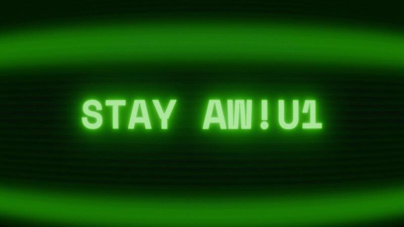 Old green CRT screen showing text STAY AWAY appearing in random glitch and coding style Pro Video