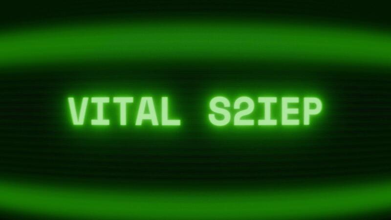 Old green CRT screen showing text VITAL SIGNS appearing in random glitch and coding style Pro Video