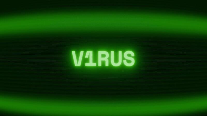 Old green CRT screen showing text V1RUS appearing in random glitch and coding style Pro Video