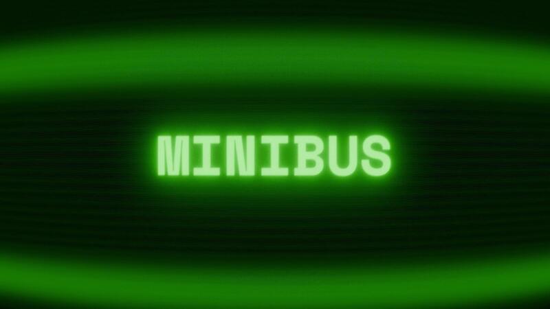 Old green CRT screen showing text MINIBUS appearing in random glitch and coding style Pro Video