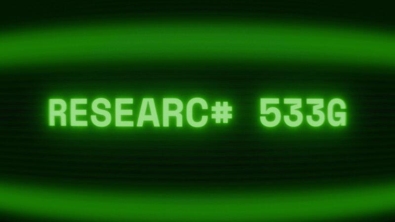 Old green CRT screen showing text RESEARCH TEAM appearing in random glitch and coding style Pro Video
