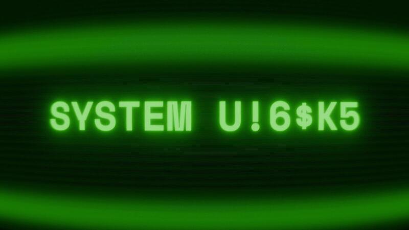Old green CRT screen showing text SYSTEM NOTICE appearing in random glitch and coding style Pro Video