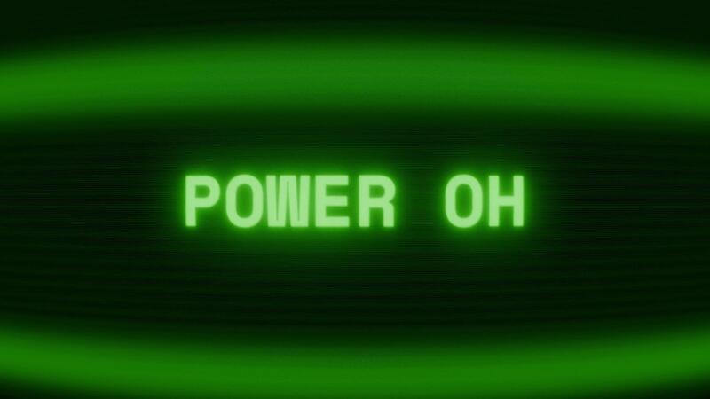 Old green CRT screen showing text POWER ON appearing in random glitch and coding style Pro Video