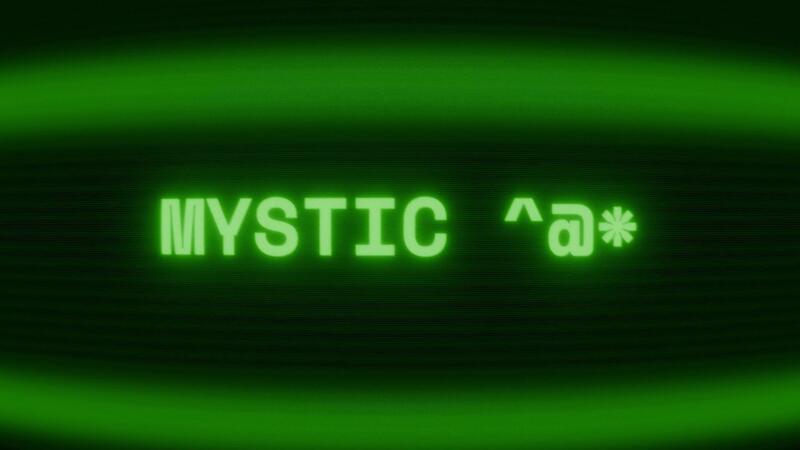 Old green CRT screen showing text MYSTIC EYE appearing in random glitch and coding style Pro Video