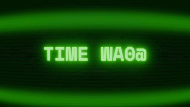 Old green CRT screen showing text TIME WARP appearing in random glitch and coding style Pro Video