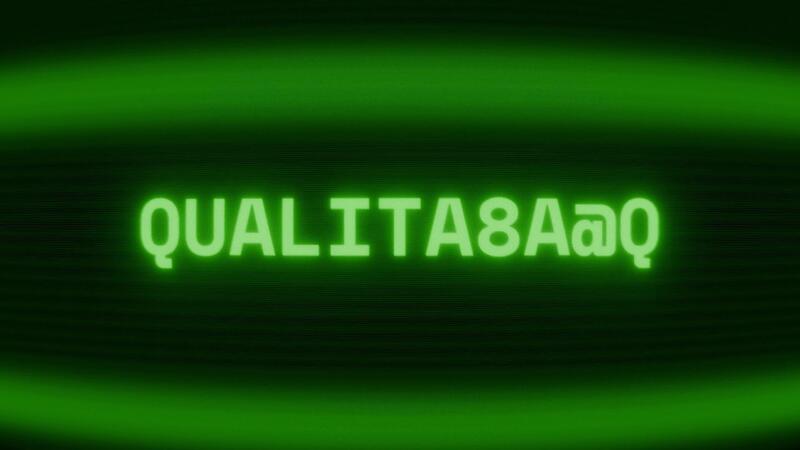 Old green CRT screen showing text QUALITATIVE appearing in random glitch and coding style Pro Video