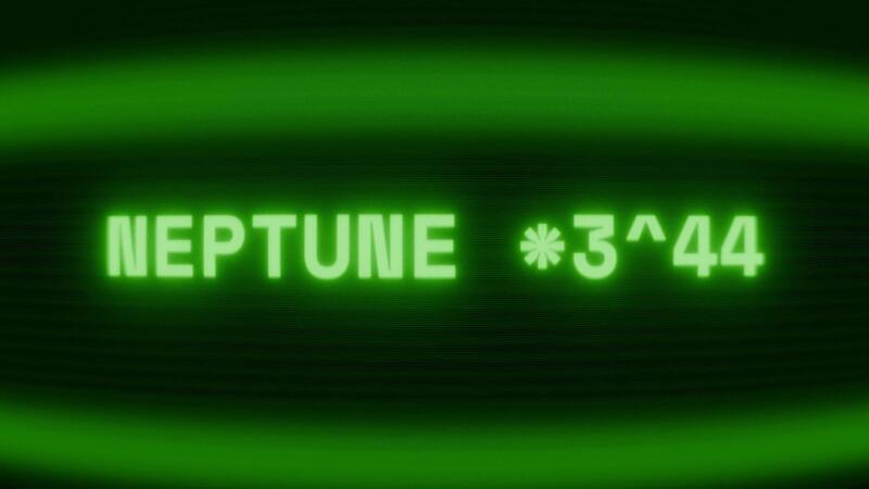 Old green CRT screen showing text NEPTUNE ORBIT appearing in random glitch and coding style Pro Video
