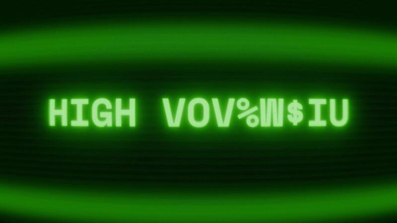 Old green CRT screen showing text HIGH VOLTAGE appearing in random glitch and coding style Pro Video
