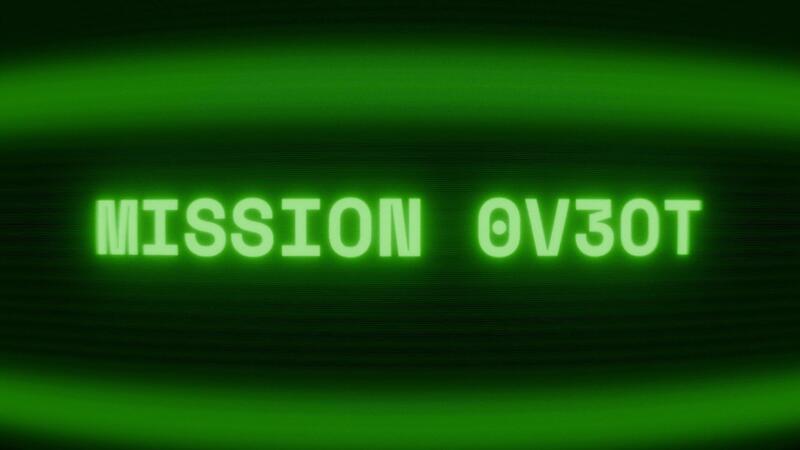 Old green CRT screen showing text MISSION START appearing in random glitch and coding style Pro Video