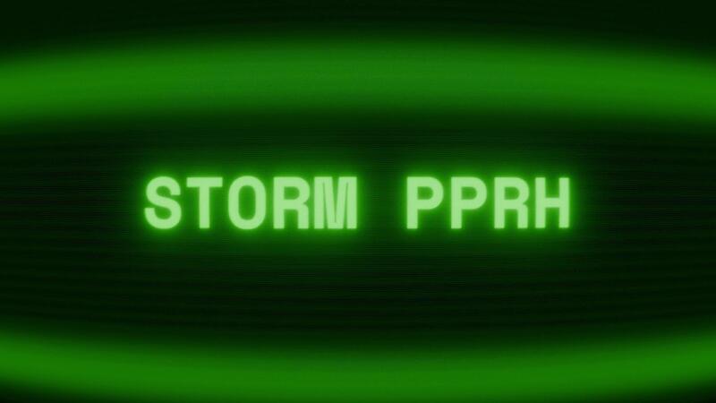 Old green CRT screen showing text STORM PASS appearing in random glitch and coding style Pro Video