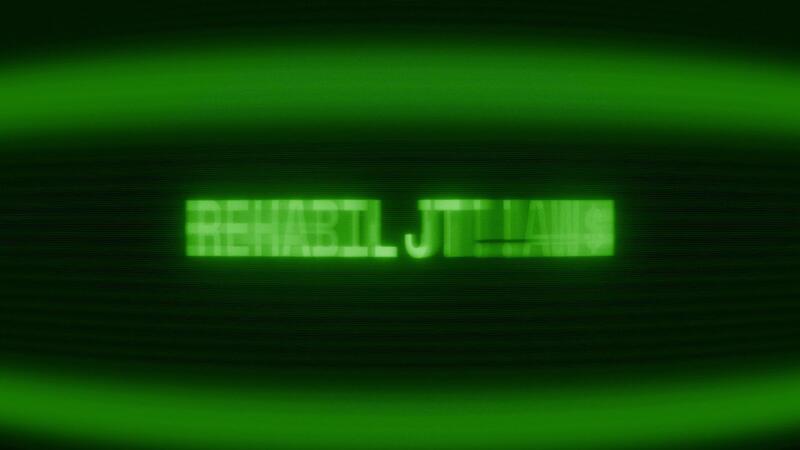 Old green CRT screen showing text REHABILITATION appearing in random glitch and coding style Pro Video