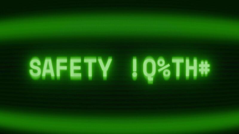 Old green CRT screen showing text SAFETY NOTICE appearing in random glitch and coding style Pro Video