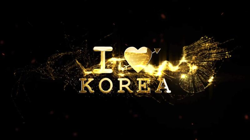 Luminous golden text 'I Love Korea' dynamically presented with sparkling particle effects on a dark background, expressing profound national passion Pro Video