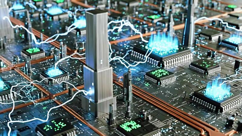 Macro View of Computer Microchips with Glowing Blue Energy and Tower Structures image photo Free Video