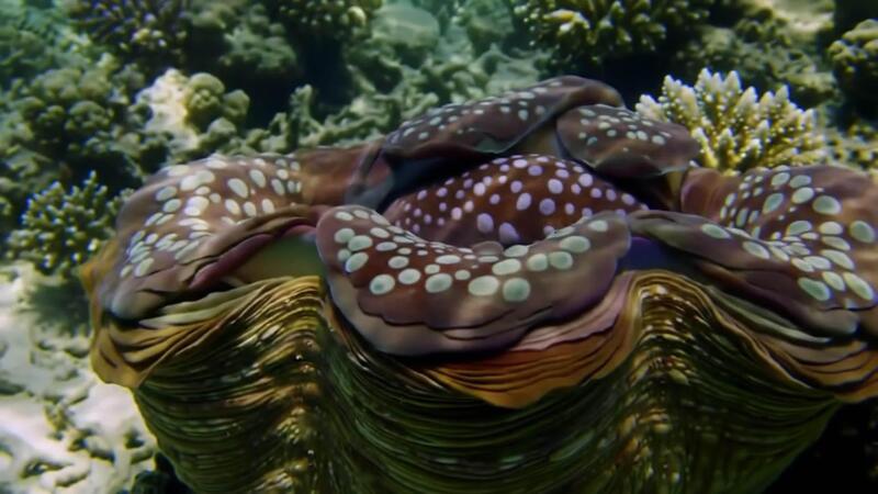 Underwater close up of a large clam with intricate patterns and textures Free Video