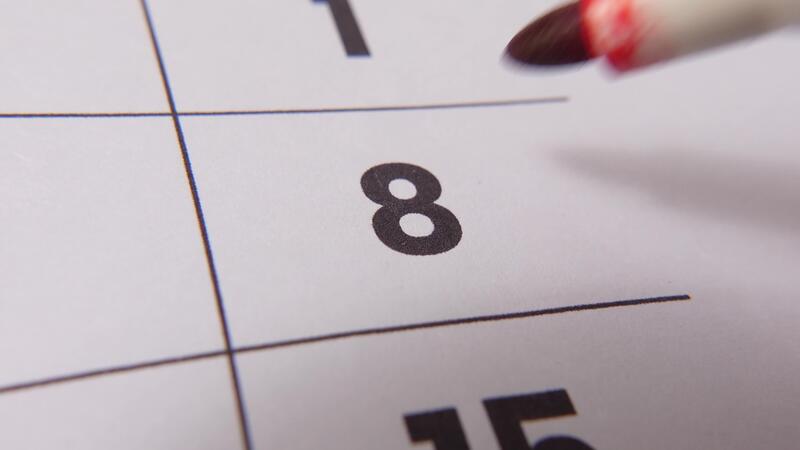 Highlighting date number 8 on a calendar, with a bold red cross mark emphasizing an important reminder or scheduled event. Pro Video