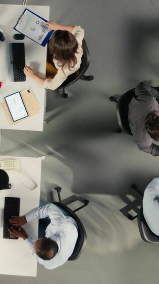 Vertical Top down view zoom in of coworkers collaborate on report writing and data visualization. The team focuses on performance objectives, management strategy and efficient report sharing. Camera A. Pro Video