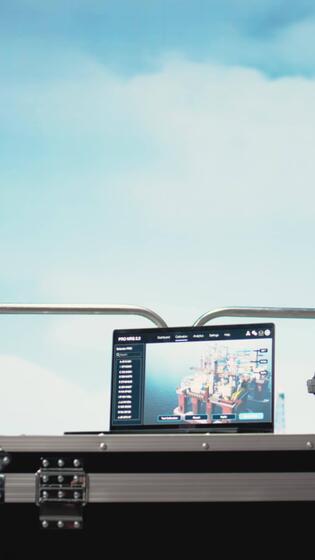 Vertical Laptop on offshore platform with predictive software analyzing rig operations. Notebook on drilling barge deck with remote control interface managing rig equipment, tracking production efficiency Pro Video